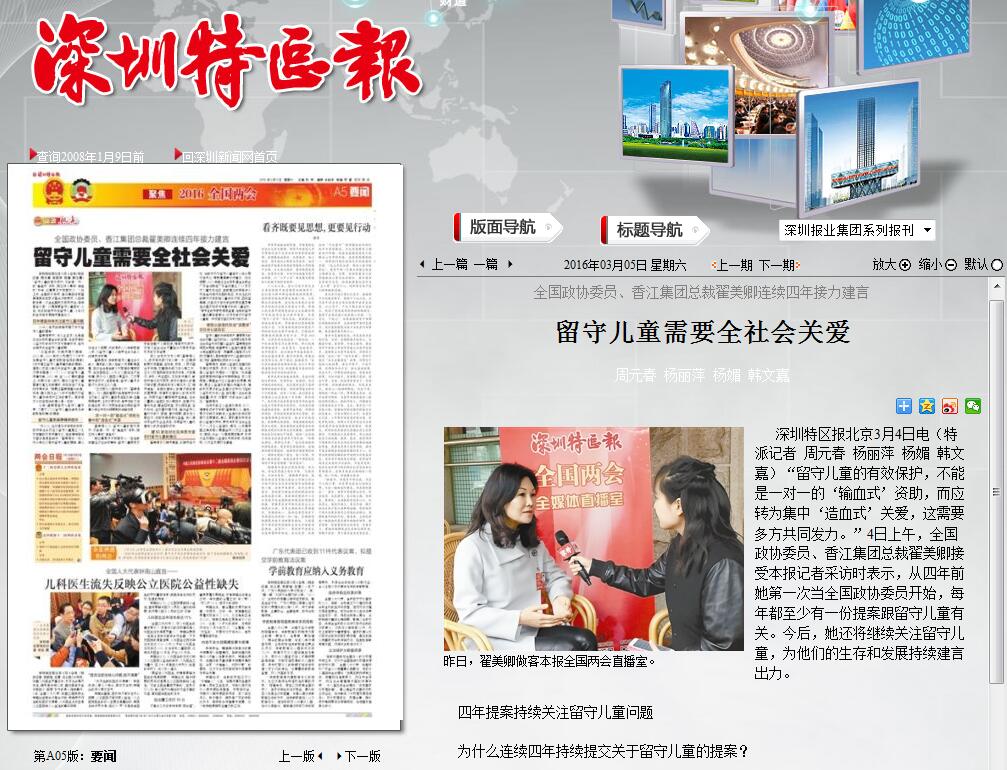 翟美卿表示,作為企業(yè)家,也是香江社會(huì)救助基金會(huì)的主席,她在平常的公益行動(dòng)中與農(nóng)村孩子接觸較多,自然會(huì)持續(xù)關(guān)注留守兒童問題。